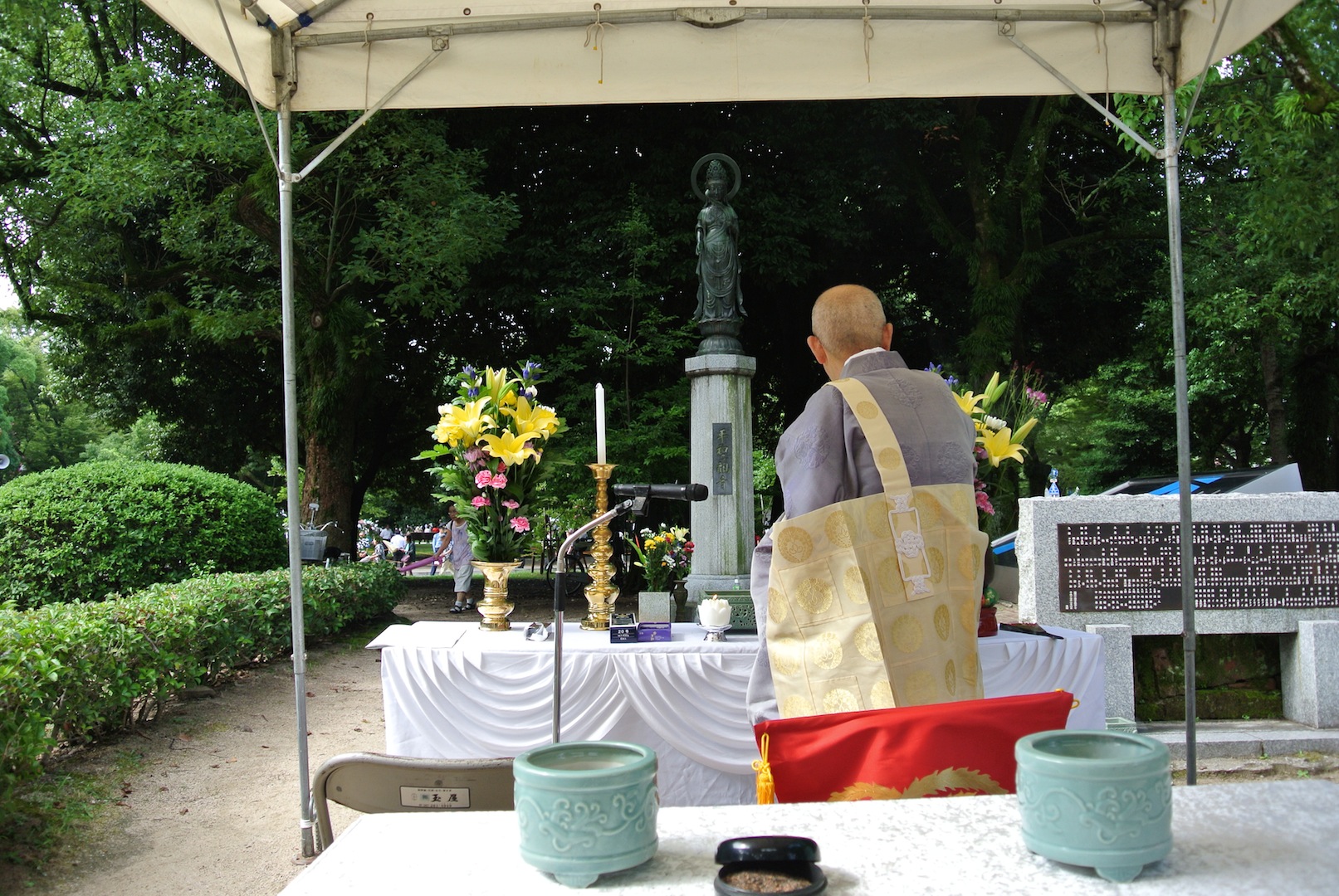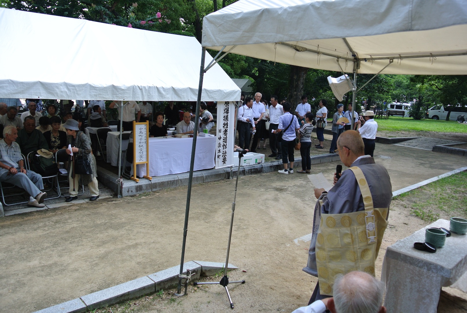例年8月6日午前8時15分、平和の鐘と共に開始される「平和記念式典」が終わる頃、同じ平和公園敷地内にある平和観音像前で「旧中島本町原爆追悼法要」が始まります。
