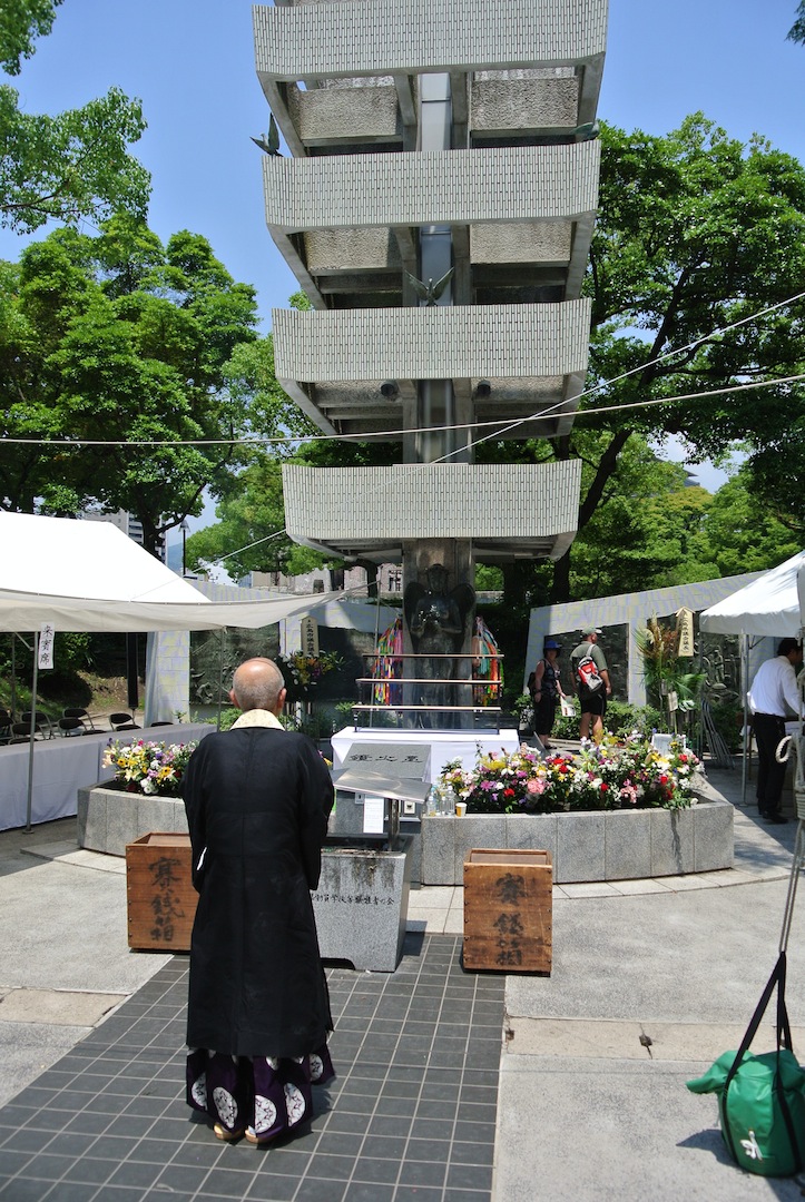 法要終了後、原爆ドームのすぐ傍にある「動員学徒慰霊塔」に向かいました。ここの名簿には、住職の姉の名前が掲載されています。軍国主義に煽られて、新緑の輝きのような青春を犠牲にし、国のためにと尽くしながら、極限の苦痛の中でその尊い生命を奪われていった無念の歴史があります。