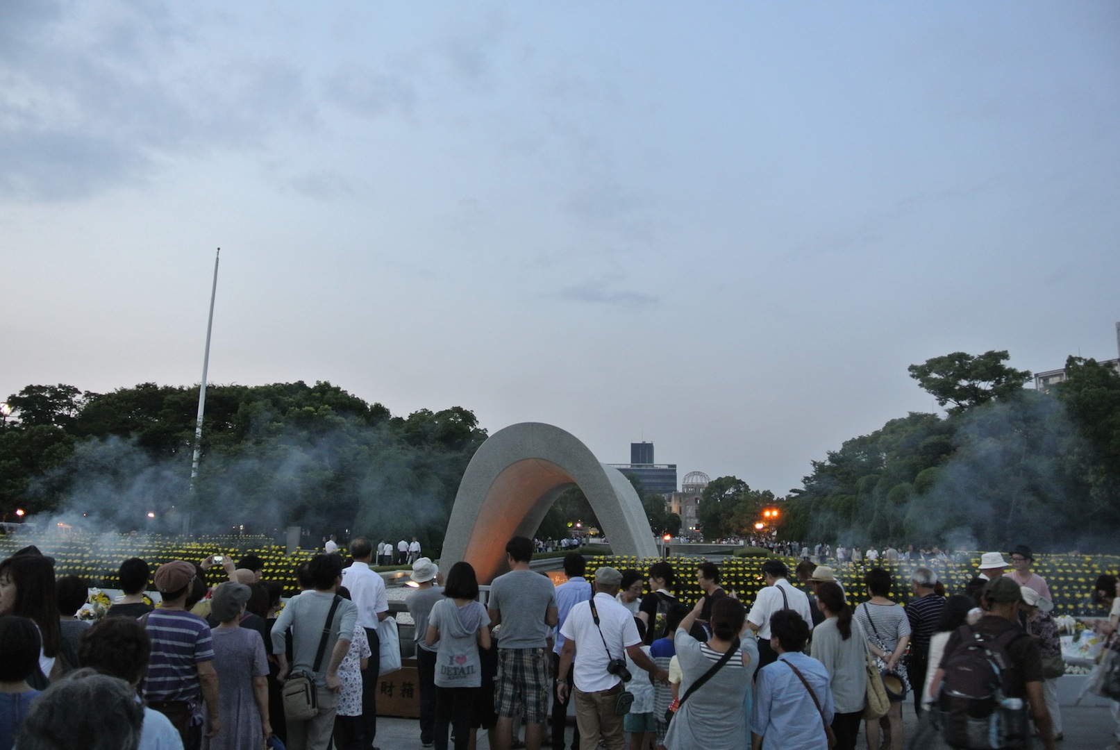 (場面は変わって、下写真は、8・6夕方の平和公園。多くの人が列をつくり、慰霊碑の前で手を合わせようと並んでいます)