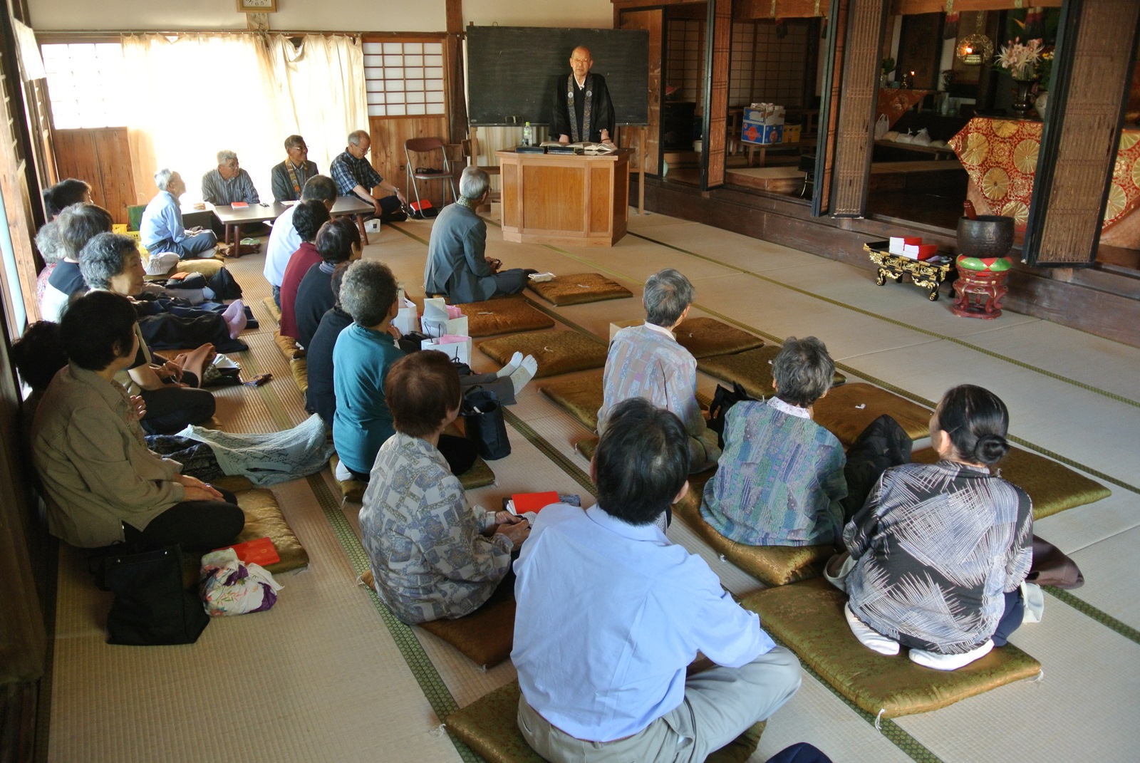 今日(10月12日)は、見下ろす盆地の中央辺りに所在する、福正寺の報恩講と永代経法要があります。福正寺は坊守(お寺の奥さん)の里で、今は無住ゆえ、年に一度ながらこの時期に、我ら淨寶寺が法要をお勤めさせて頂くのです。