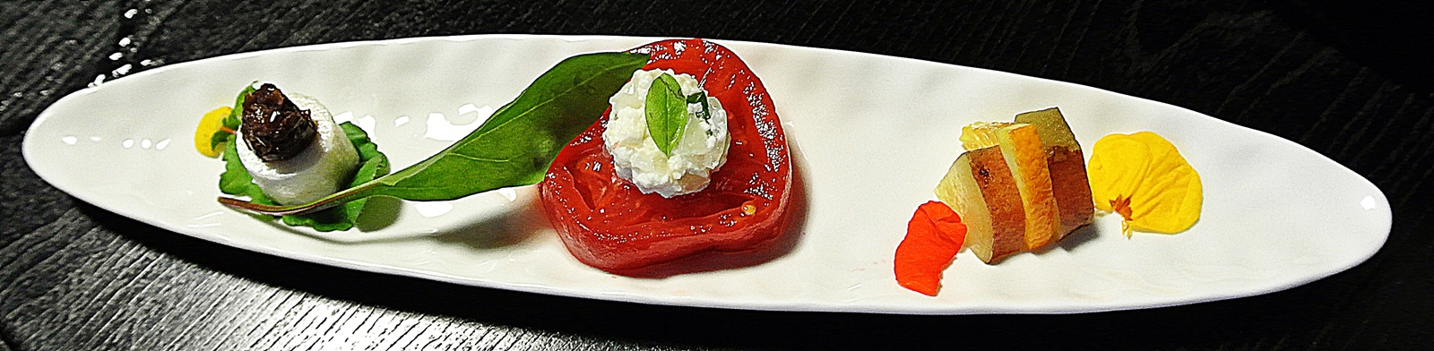 上の舟形の小皿は、左から、豆腐に大徳寺納豆を載せルッコラの葉と一緒に食べます。中央はトマト&タマネギ&豆腐のマリネ。一番右はサツマイモのオレンジ煮。ナスタチウムの花びらが可愛らしいアクセントになっています。見てよし、食べてよしのアミューズ的な一皿。冷えた白ワインによく合います。