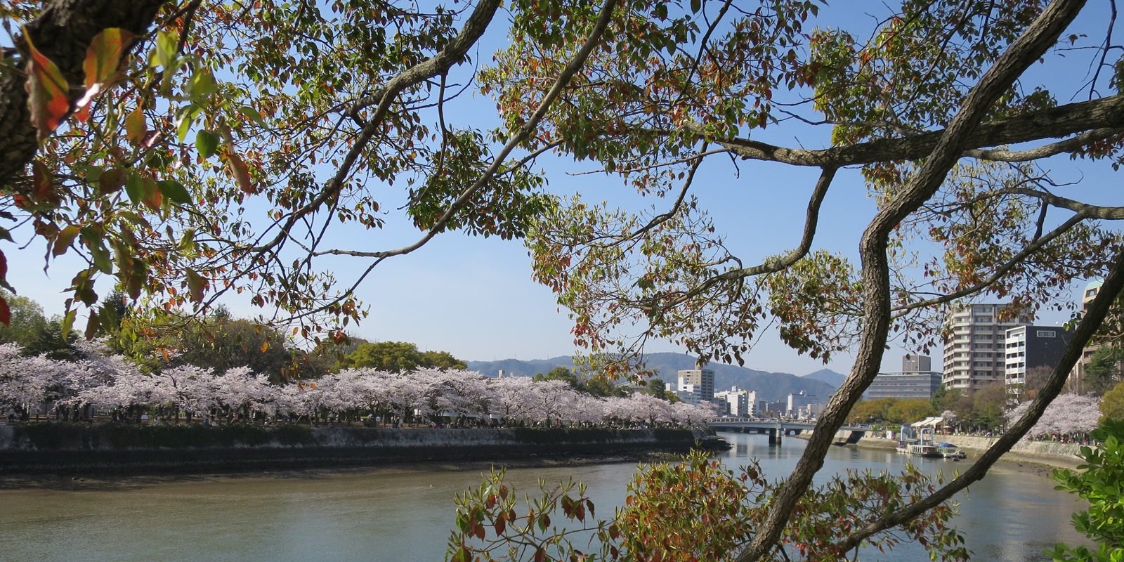 今日の午後はシャツ一枚でも過ごせる温かい日和でした。元安川沿いの平和公園の桜も満開で、川端はお花見の散歩客でにぎわっていました。