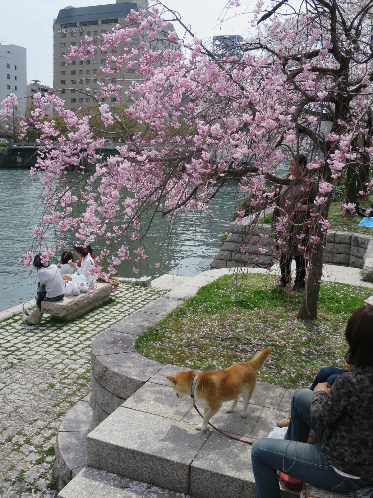 しだれ桜は、川岸が似合います。柴犬と桜もなかなかの取り合わせ。