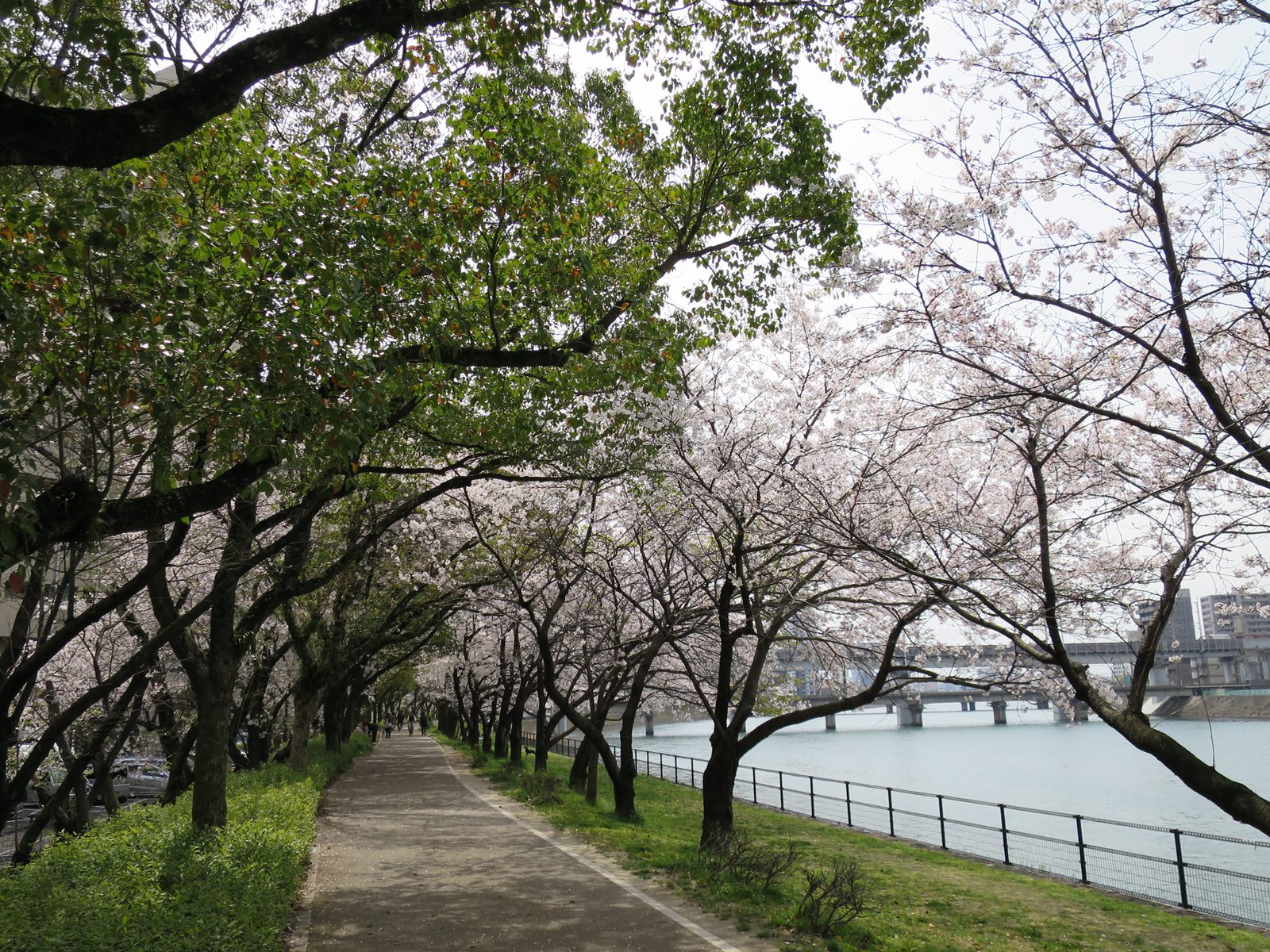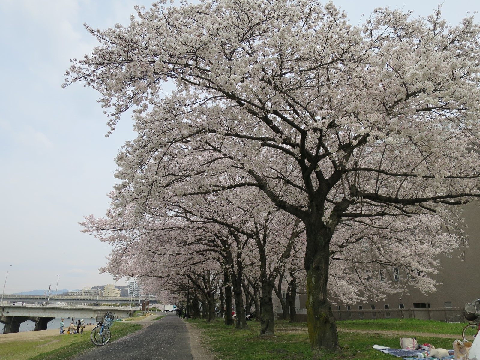 相生橋を渡り北上。元広島市民球場横の土手です。ずーっと先の方まで桜が連なっています。