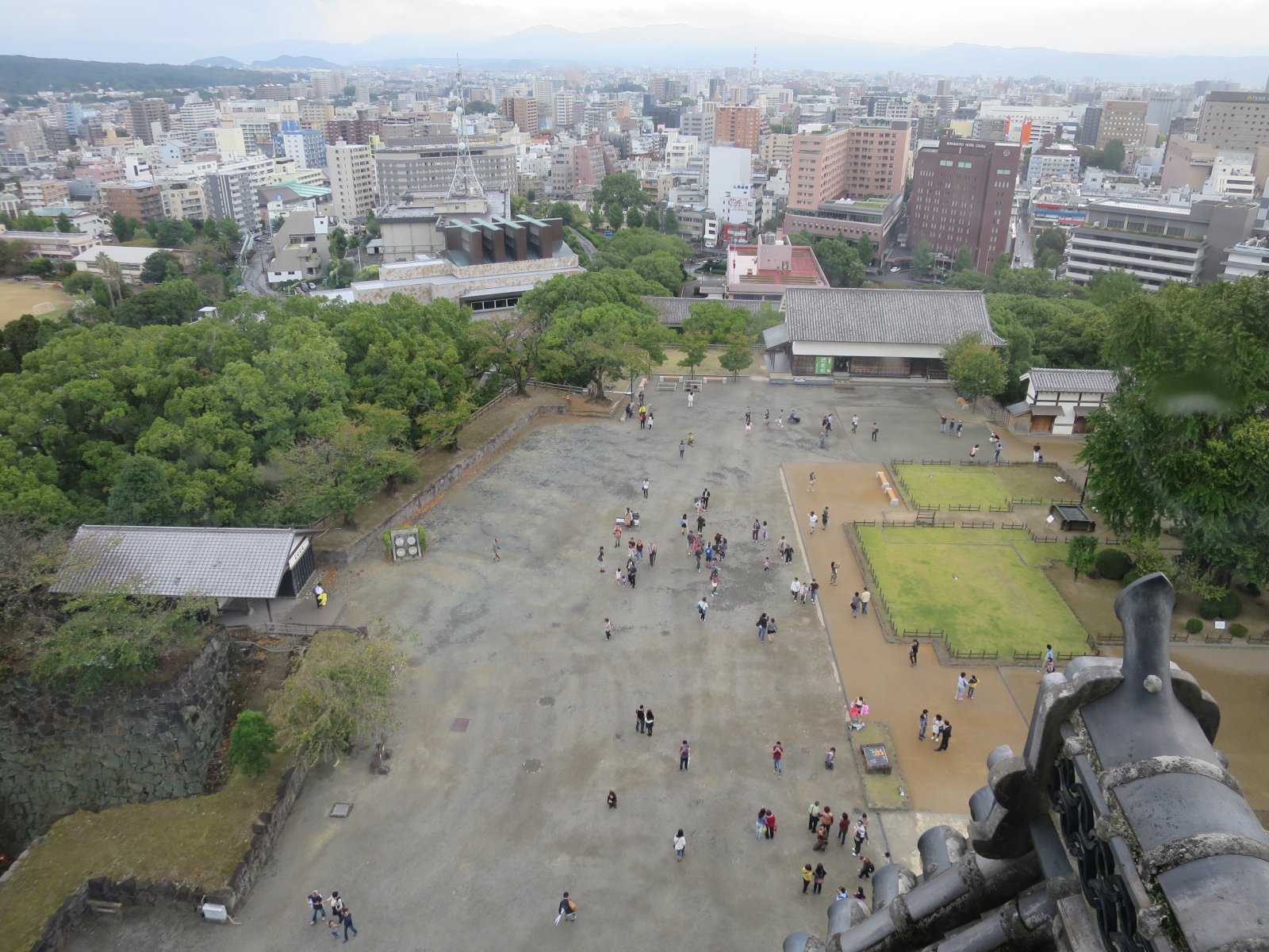 これが天守閣最上層階からの眺め。熊本市街が一望です!これだけ見晴らしが良ければ異変にも即気付いたことでしょう。しかし、高すぎてこわいんですけど。