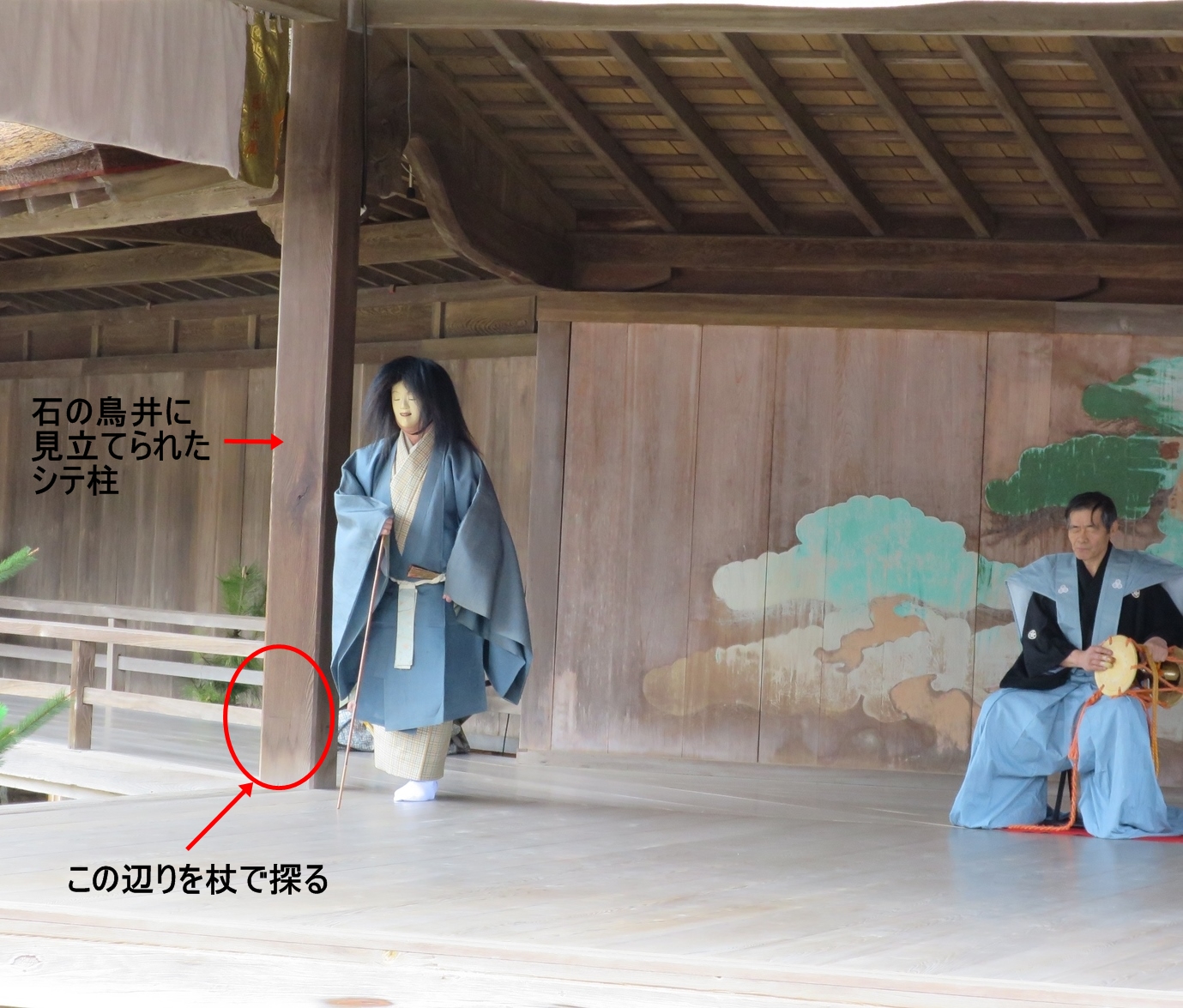 揚げ幕から登場して、橋掛りを参道に見立て、盲目ゆえに杖を頼りに静かに歩みを進めます。そしてシテ柱が四天王寺へ入る石鳥居。そこで俊徳丸は確認のため、杖で鳥井の柱(シテ柱)を探ります。