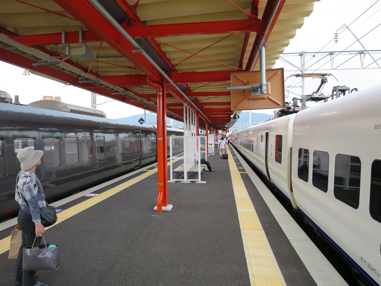 朱に塗られた駅の柱。停車した上下線の特急列車・・・