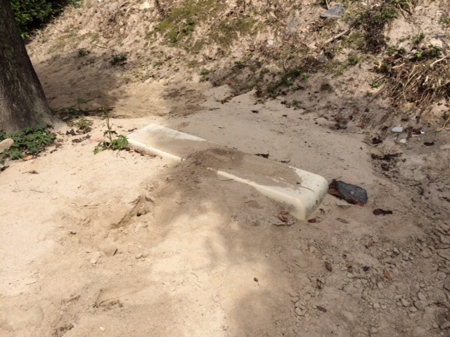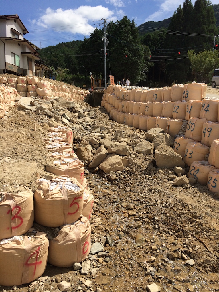 土砂でベンチが埋まっています。この泥を撤去し土嚢袋に入れて積み上げて行きました。