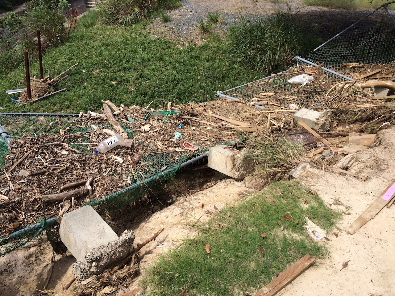 この写真は公園の下手。川が氾濫して公園に流れ込み、フェンスを土台ごとなぎ倒した模様。
