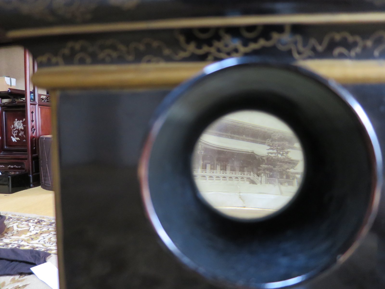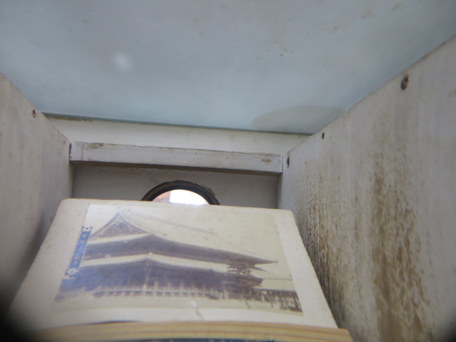 お宝拝見 2015 9/29 管理人ブログ 2015年9月29日 前回、島根は飯南町の明眼寺さまに寄せて頂いたことをブログに書きましたが、ご住職よりある「お宝」を拝見させて頂きました。 何でもその「お宝」を持って、かの人気番組『何でも鑑定団』へ出演されたそうです。 しかも、地方の体育館なんかで、声のやたらとでかい松尾伴内にいじられるやつではなく、 石坂浩二や島田紳介(当時)のいるスタジオだったとのこと! これは期待できます!お宝拝見! 何やら年季の入った箱が出て来ました・・・「寫眞眼鏡」(しゃしんめがね)と筆で書かれています。 蓋を取ると、きれいな柄の箱のようなものが出てまいりました。 側面に手書きで梅などの花々が描かれており、台座部には鶴の蒔絵。 あのセリフが頭に思い浮かびましたが、ベタなので口に出すのは辛うじて思いとどまりました。 (いい仕事してますねえ~) 「寫眞眼鏡」というから、何かを見たりするんでしょう。 そう言えば横に望遠鏡の覗き窓みたいなものがあります。すると天井の白濁したアクリル板は明り取りのようなものか。 顔を近づけると、何かが見えます! これは京都「東本願寺御影堂」! 絵の下にある金属製の丸いボタンのようなものを回すと・・・ おやおや写真が回転しはじめました。(!向こう側にも覗き窓が!) チン!という音が鳴るのは中々洒落た演出、今度は「熊野那智観音堂」が現れました! 写真は入れ替え可能とのこと。3D映像さえ珍しくも何ともない現代では、さほどびっくりするようなギミックではないのですが、この箱が作製された明治25年頃にあっては、相当人びとを楽しませたことでしょう。 さて、『何でも鑑定団』というからには、気になるのがお値段。 スタジオ出演ですから、相当お高いんでしょう?ご住職。 本人評価額は? 「いやあ、最初は50万円って言おうと思ったんじゃけど、結果の金額が低いと何か欲張っとったみたいで恥ずかしいじゃない。だから30万って言ったんよ。」 おお!その心理わかります! 妙に自信あって強気な金額で攻めるも、結果二束三文だった・・・ということが頻繁に起こり得る『何でも鑑定団』。我ら視聴者からすれば痛快極まりないのですが、当事者にとっては痛恨の極み。それは避けたい。しかし、「じゃあ1万円で」などと言えば「保険掛けたな」とチキン呼ばわりされることは必定。行くも地獄、戻るも地獄の難しい状況で30万円とは何とも絶妙な金額設定です。30万円と言えば大体世間様ひと月分のお給金。「それくらいの値段がついたら嬉しいよね」、という庶民感覚から逸脱していません。50万だとちょっと欲張り感が生じてきます。そして、たとえ結果惨敗だったとしても、「この一品ならば30万くらい考えるよね」と許容される範囲です。 さて、オープンザプライス。 (続く) 管理人ブログ 島根の名刹 スリランカ滞在記(9) この記事を書いた人 管理人 関連記事 素晴らしき世界 2021年3月3日 ANT-Hiroshima 被爆証言と医科学的解説シリーズ 第3回「原爆投下直後から約1ヵ月、救護活動に従事した11歳と13歳の少女たち」 2019年8月19日 ANT-Hiroshima 被爆証言と医科学的解説シリーズ 第1回「爆心地から540mで被爆した少女」 2019年1月29日 全戦争死没者追悼法要~前住職が法話します 2018年7月1日 スリランカ滞在記(42) 2017年11月6日 スリランカ滞在記(41) 2017年9月1日 平和之観音 2017年8月6日 スリランカ滞在記(40) 2017年5月16日 コメント コメントする コメントをキャンセルコメント ※ 名前 メール サイト 次回のコメントで使用するためブラウザーに自分の名前、メールアドレス、サイトを保存する。